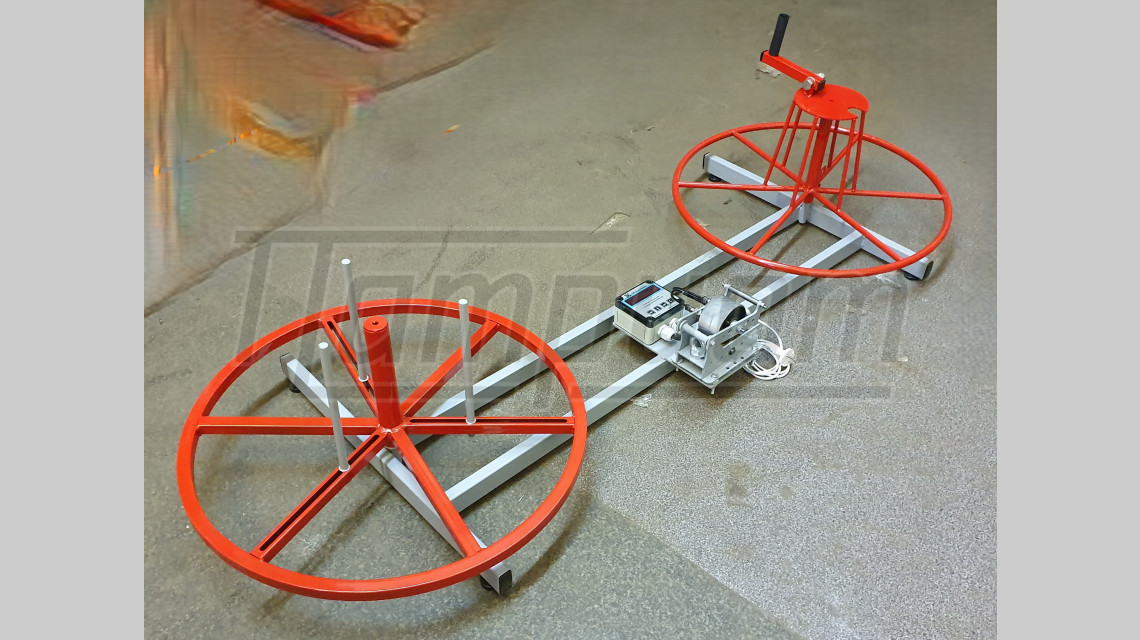 Устройство перемотки кабеля МПК 0,6-30Рэ Патриот состоит из следующих основных частей: сварная рама на регулируемых винтовых опорах (ножках), подающий технологический барабан, измеритель длины кабеля МИД 20 Патриот, приёмный технологический барабан со складной ручкой.