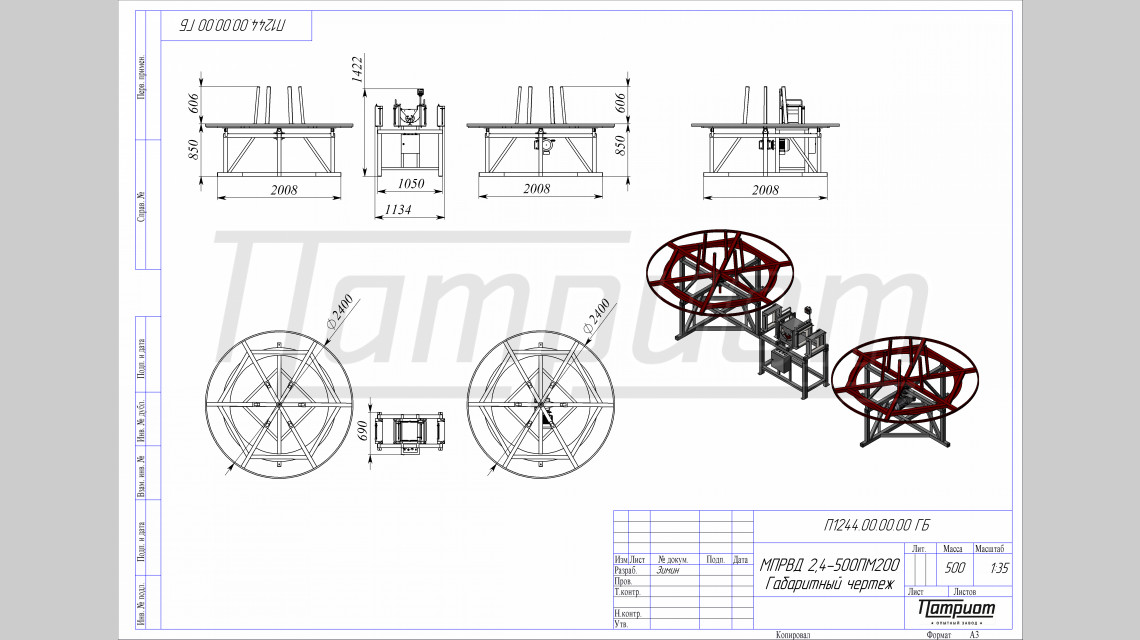 Станок МПРВД 2,4-500ПМ200 Патриот предназначен для проведения мерных отмоток рукавов высокого давления, шлангов, труб диаметром до 200 мм из бухты в бухту диаметрами до 2400 мм и массой до 500 кг.