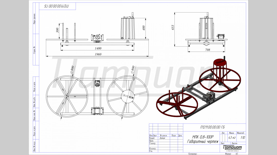 Кабелеотмотчик МПК 0,8-100Р Патриот производства компании Опытный завод "Патриот" позволяет производить мерную отмотку кабеля и провода диаметром до 40 мм с кабельных бухт и катушек диаметром до 800 мм и массой до 100 кг.
