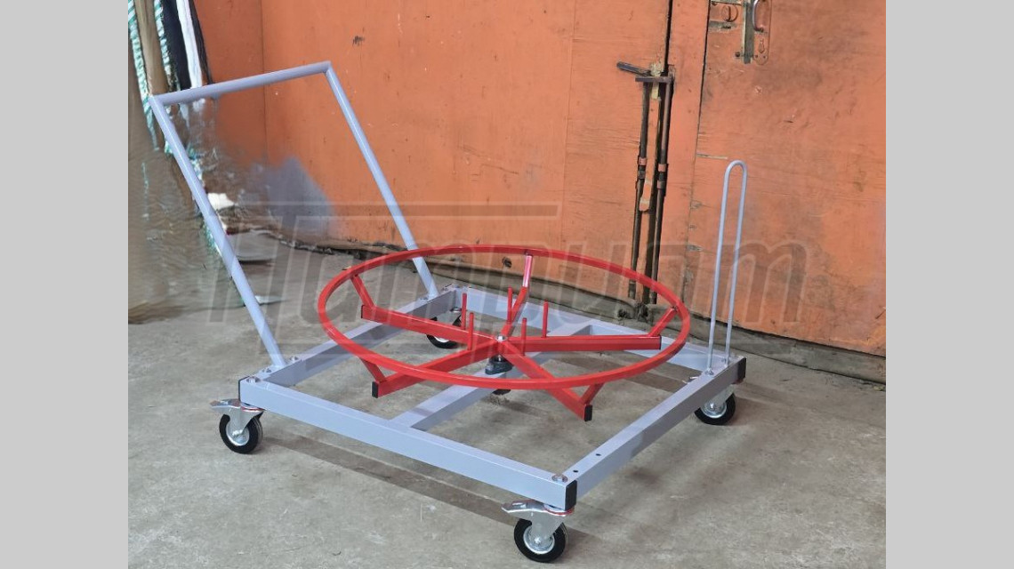 Тележка ТБРВД 1-200 предназначена для транспортировки, перемещения, хранения и размотки бухт рукавов высокого давления и шлангов, позволяющая устанавливать бухты массой до 200 кг диаметром до 1 м.