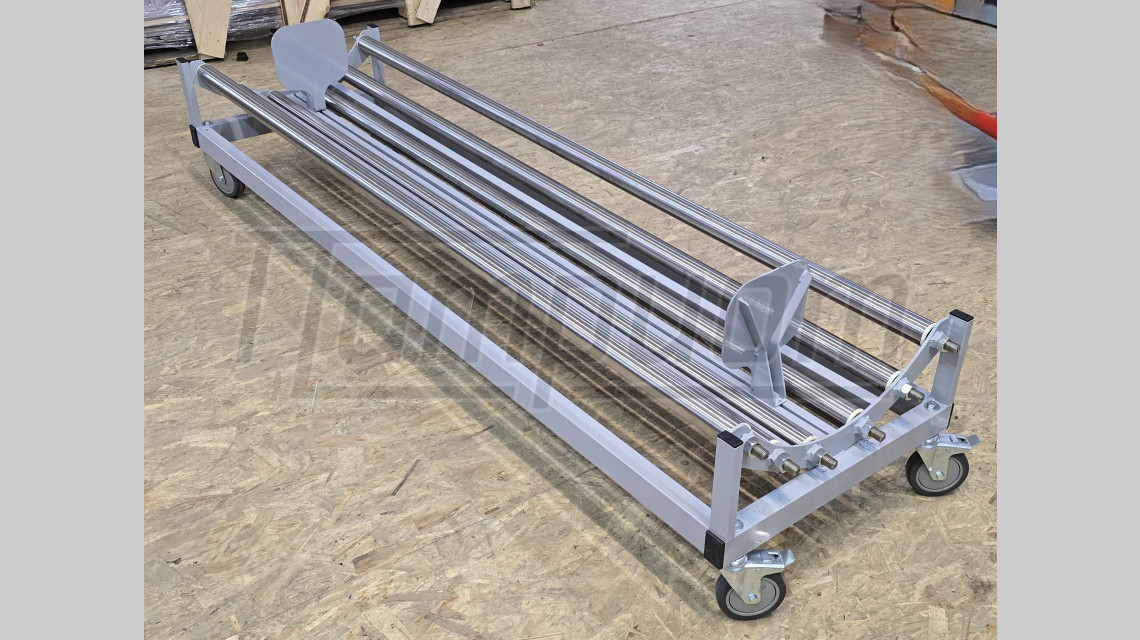 Тележка состоит из сварной рамы с четырьмя поворотными колёсными опорами с тормозными механизмами и шести роликов из нержавеющей трубы, установленных на шарикоподшипниках.