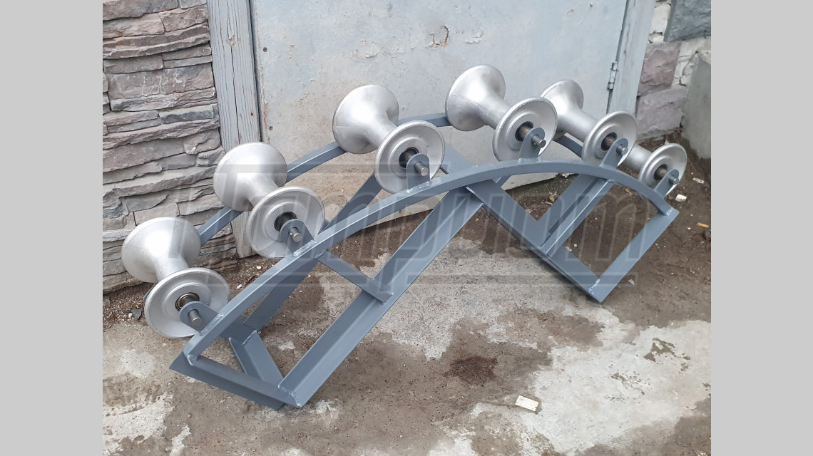 Рама ролика выполнена из профильной трубы и уголка, алюминиевые валики установлены на мощных шариковых подшипниках, обеспечивающих надёжную бесперебойную работу под нагрузкой в течение всего срока эксплуатации. Алюминиевые валики надёжно защищают кабель от повреждений при протяжке.